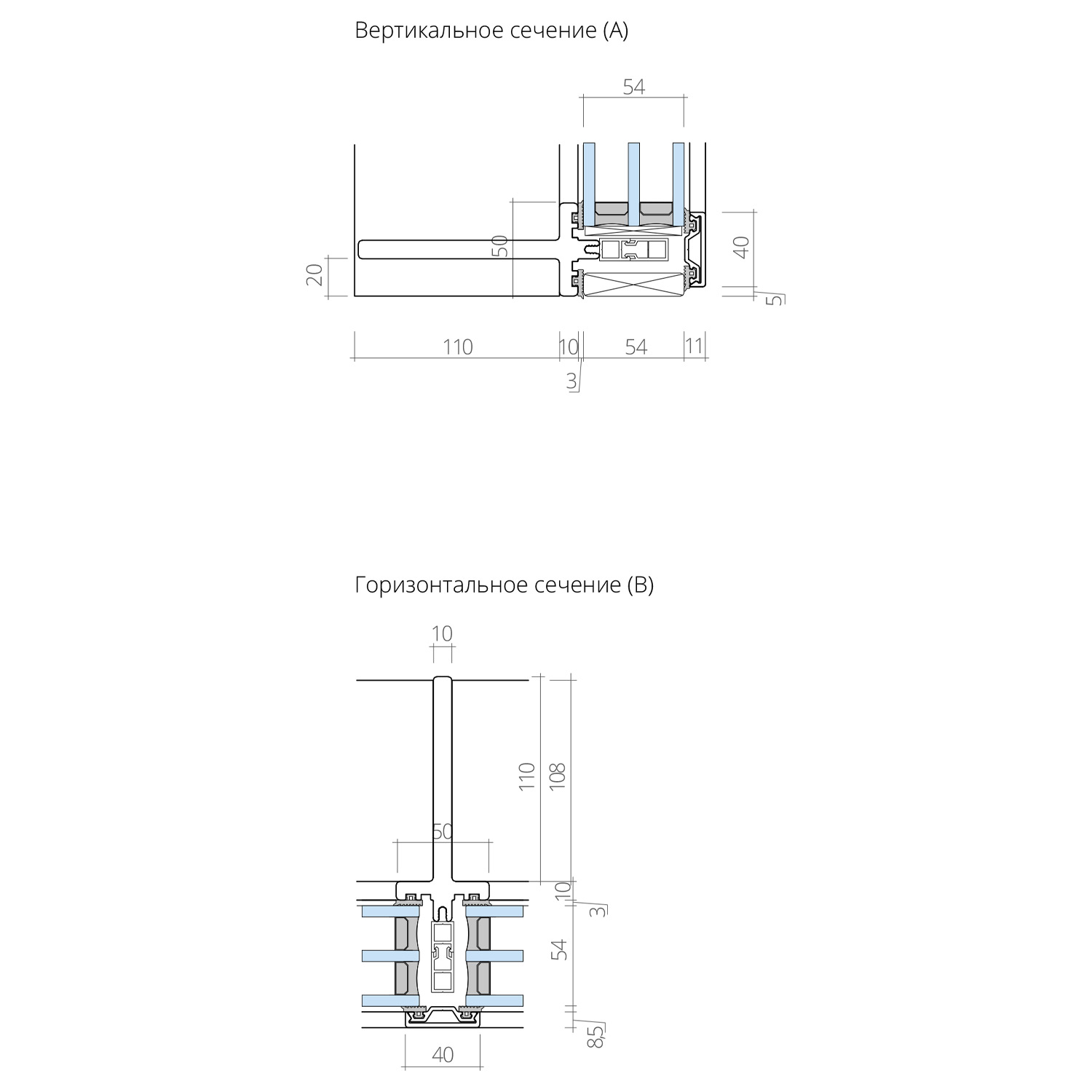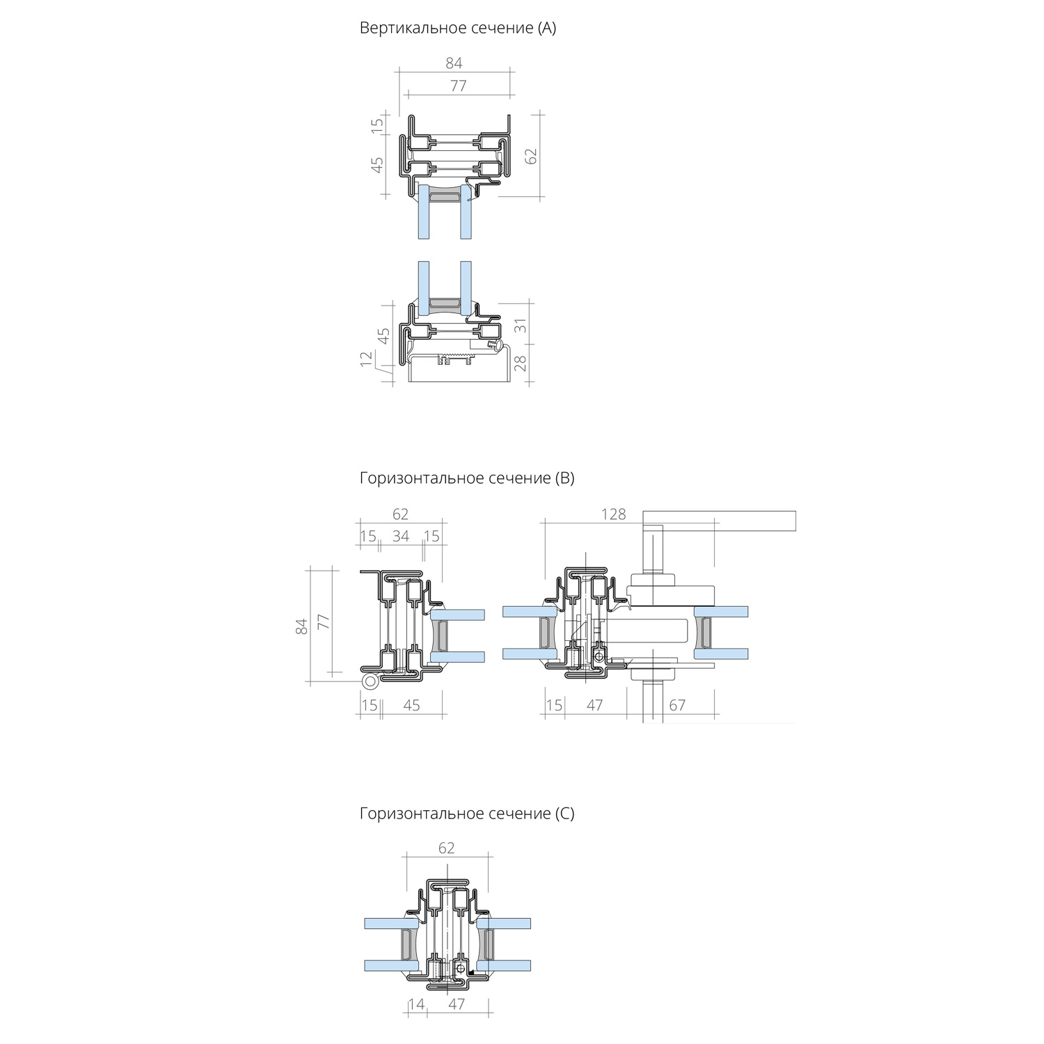 Rolled door profile. It can be made in galvanized and stainless steel, as well as in brass. Due to the presence of thermal fracturing, it is used in the middle zone of Russia. The system depth of the profile is 85 mm, the width of the stud joint is variable from 68 to 114 mm in the area of the locking mechanism.