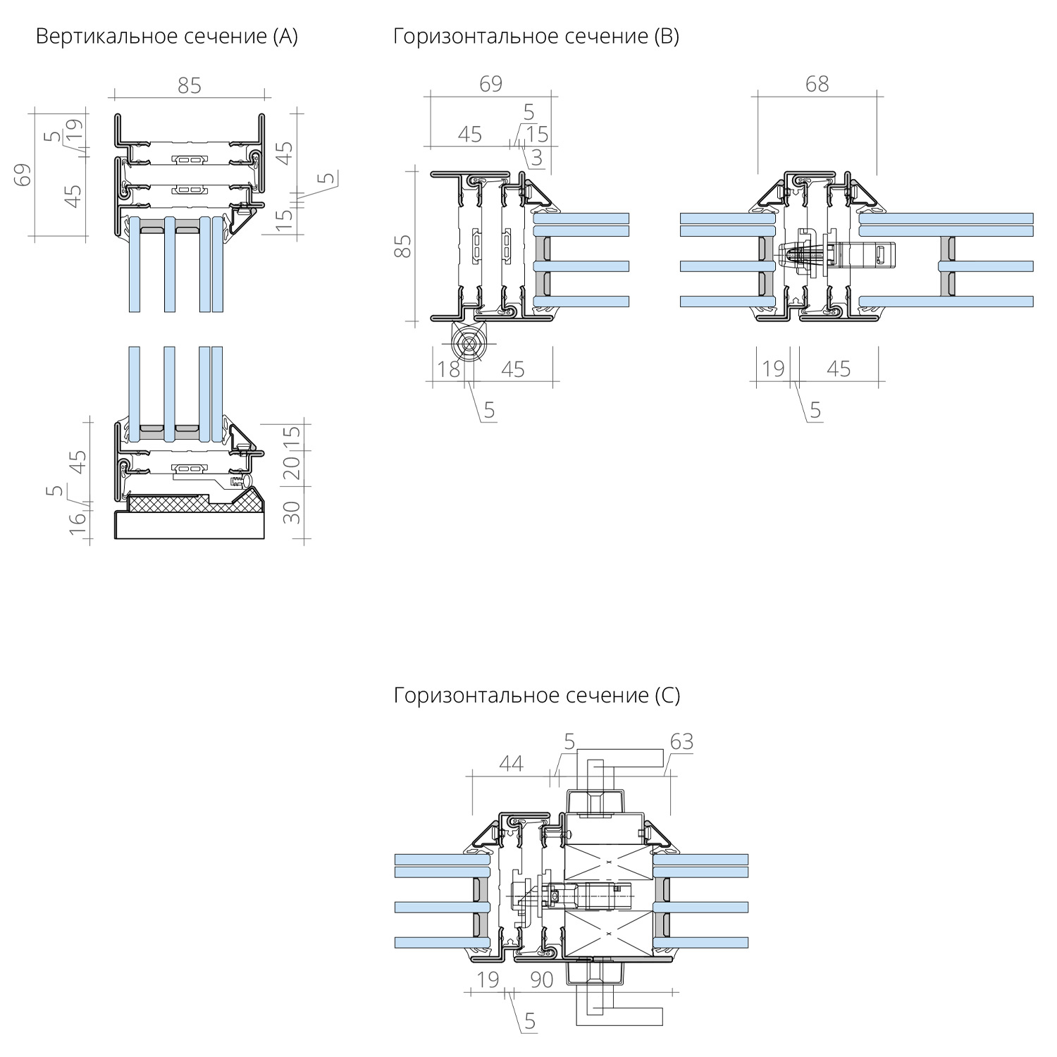 Rolled window profile. It can be made in galvanized and stainless steel, as well as in brass. Due to the presence of thermal fracturing, it is used in the middle zone of Russia. The system depth of the profile is 85 mm, the width of the stud joint is 68 mm.